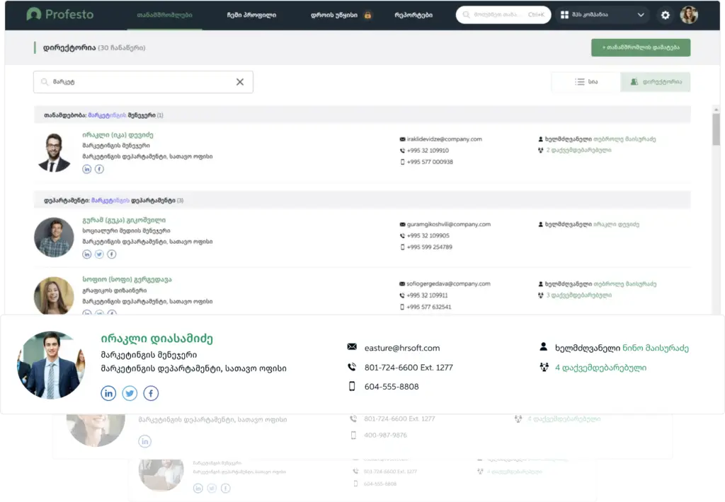 Profesto-ში უმარტივესად შეძლებთ თანამშრომლების ინფორმაციის შეყვანას, პოვნას, განახლებას და სხვადასხვა ჭრილში შეხედვას. თანამშრომლების ბაზის მოწესრიგება ისეთივე მარტივია როგორც ექსელში და ექსელისგან განსხვავებით ინფორმაცია დაცულიცაა, ცლილებების ისტორიაც ინახება და ნებისმიერ დროს ნებისმიერი ადგილიდანაა ხელმისაწვდომი.