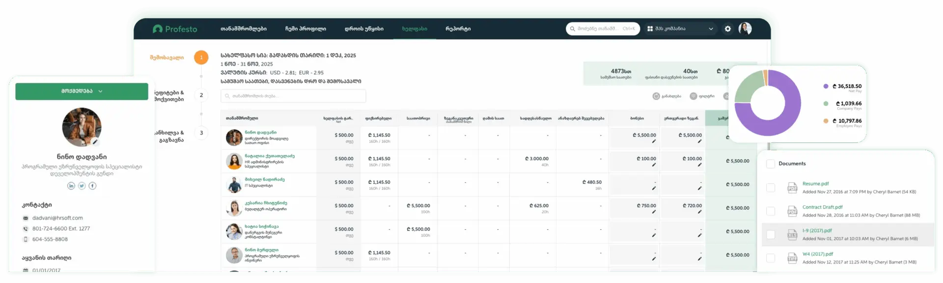 Profesto-ს საშუალებით უმარტივესად მართავთ ხელფასებს, თანამშრომლების ინფორმაციას, ნამუშევარ დროს და შვებულებებს - რეგულაციებთან სრულ შესაბამისობაში.